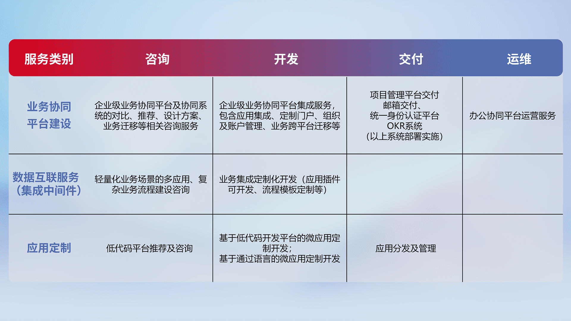 针对钉钉、、、、企微、、、IDaas等平台级产品提供产品的规划、、、方案、、交付、、、、定制化开发等服务,,实现如统一协同办公、、、智能客户服务、、、混合会议管理、、智能数据查询、、等业务场景,,,,实现数字化转型。。。