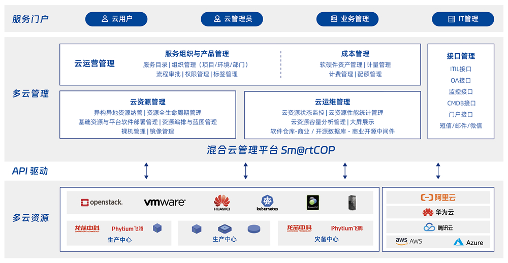 面向各行业用户多云资源管理、、、运维及服务提供的综合挑战,,提供异构异地异芯片多云资源的统一管理、、、统一运维、、、、统一监控及统一运营服务,,,,简化多云管理复杂度,,,,提升用户用云满意度,,释放云平台业务价值。。。