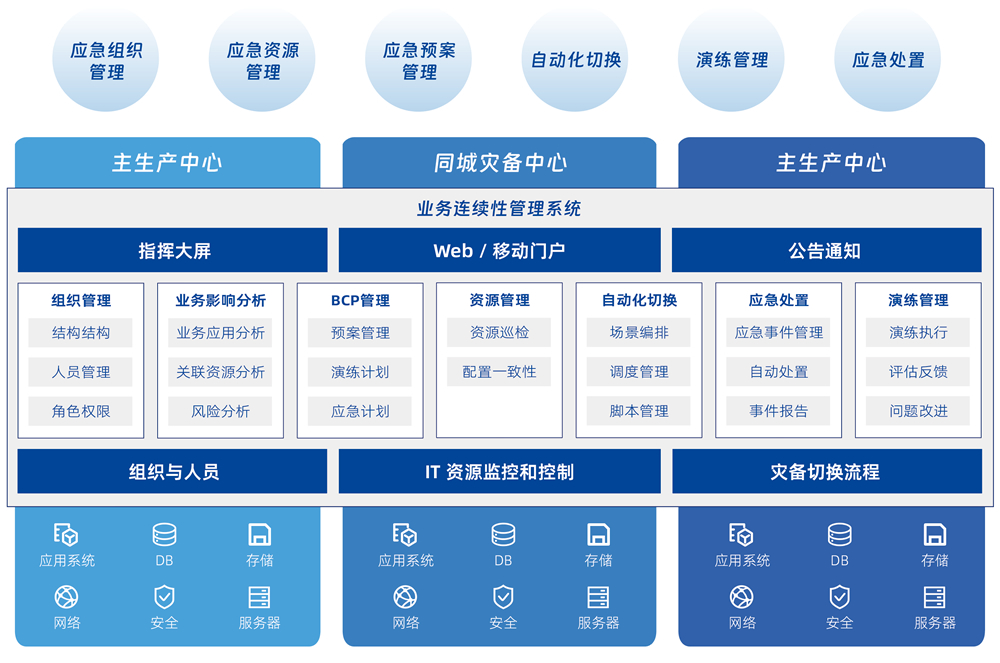基于业务连续性全生命周期管理的设计理念,,,采用一体化的技术管理平台,,将风险分析、、、业务影响度分析、、预案开发和管理、、、应急演练、、、应急响应、、应急恢复等业务连续性相关工作全面覆盖,,,帮助企业实现数字化的预案建模、、资源实例化、、预案演练、、、、预案自动化执行、、审计改进等各环节的闭环管理。。。